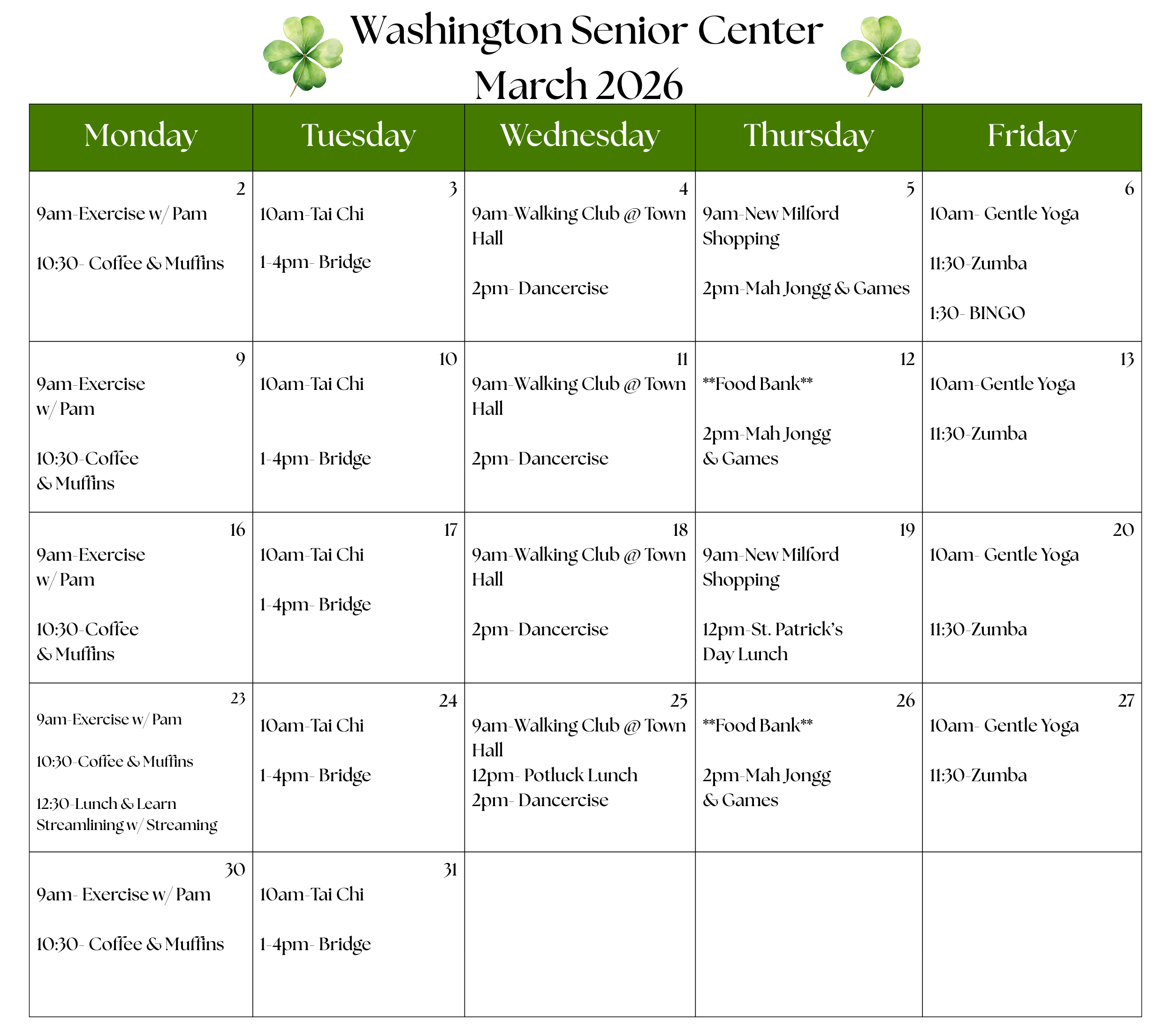Senior Center Monthly Calendar
